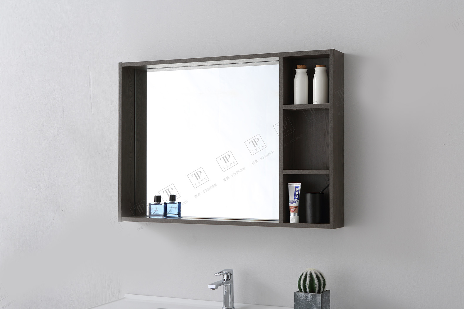 – Gương lớn kết hợp với khung gỗ đồng màu với tủ dưới. Có kèm thêm các kệ nhỏ ở bên phải để đựng đồ dùng cá nhân