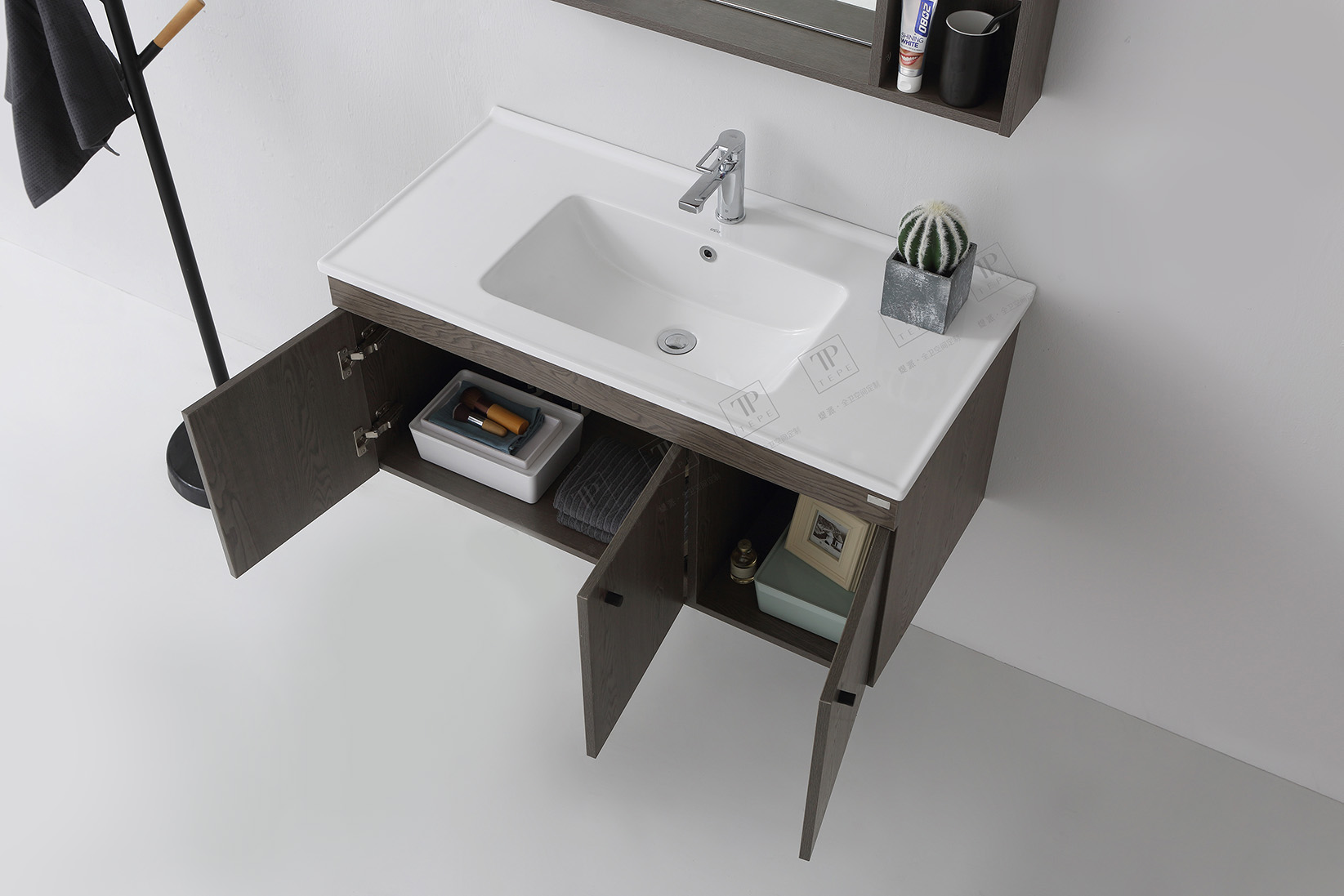 Bộ tủ chậu TP.PY30010.3 có thiết kế hiện đại và tối giản, phù hợp với không gian phòng tắm nhỏ và trung bình, không quá cồng kềnh nhưng vẫn cung cấp đủ không gian lưu trữ